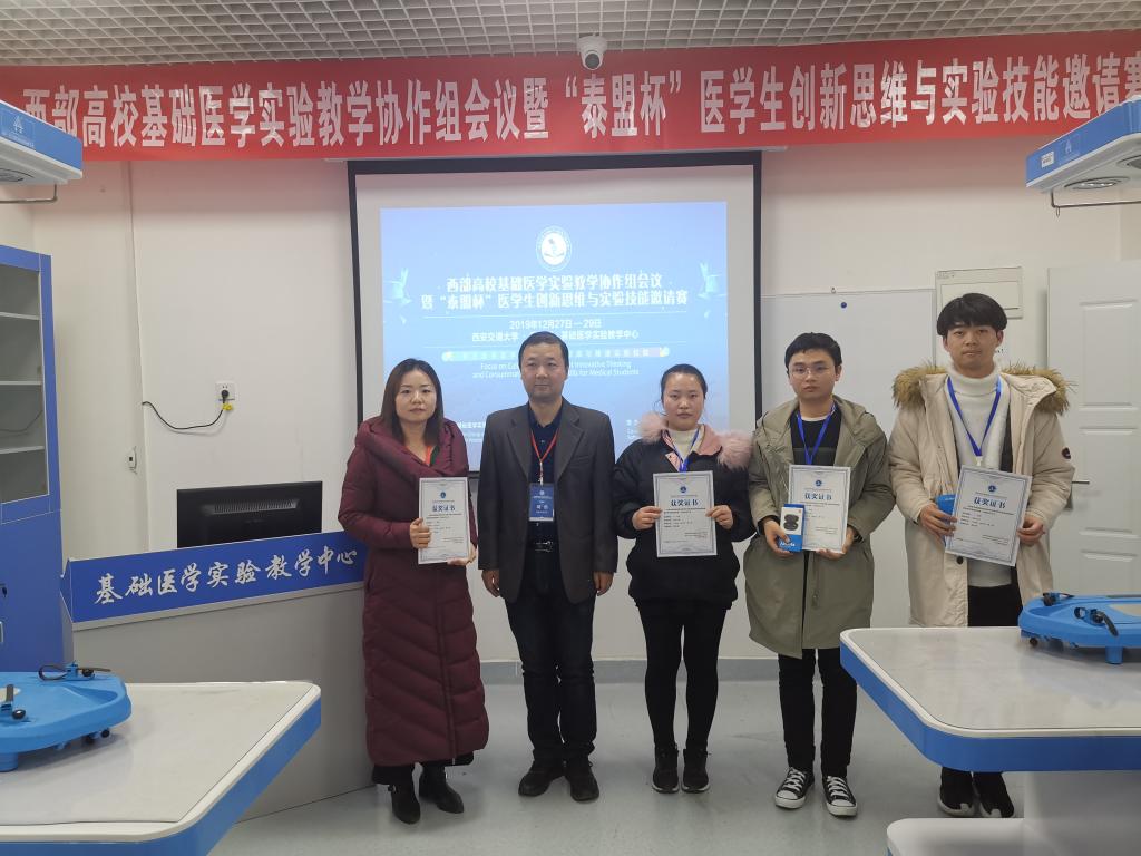 2019年12月27-30日,由西安交通大学和空军军医大学联合发起的,首届西部高校基础医学实验教学医员工创新思维与实验技能大赛在西安交通大学医学部基础医公司机能学实验中心举办。包括陆军军医大学、四川大学等在内的西部9所医学高等院校参加了此次活动。公司由医公司教学办主任高枫教授带队,王圣巍、李小记、殷松娜、张华华任指导老师,带领王宇航等9名同学参加了本次活动。